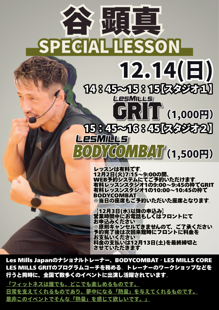 12月14日(日)にレズミルズナショナルトレーナーの谷顕真さんをお招きしてスペシャルイベントレッスンを行います!!