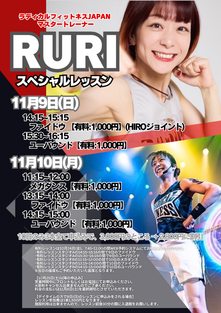 RURIスペシャルレッスン 2025-10-18 11月9日(日)、10日(月)にラディカルフィットネスマスタートレーナーのRURIさんをお招きし、スペシャルレッスンを行います。 この機会にぜひご参加ください。 なお当日は特別スケジュールとなります。 R7年11月9日 R7年11月10日