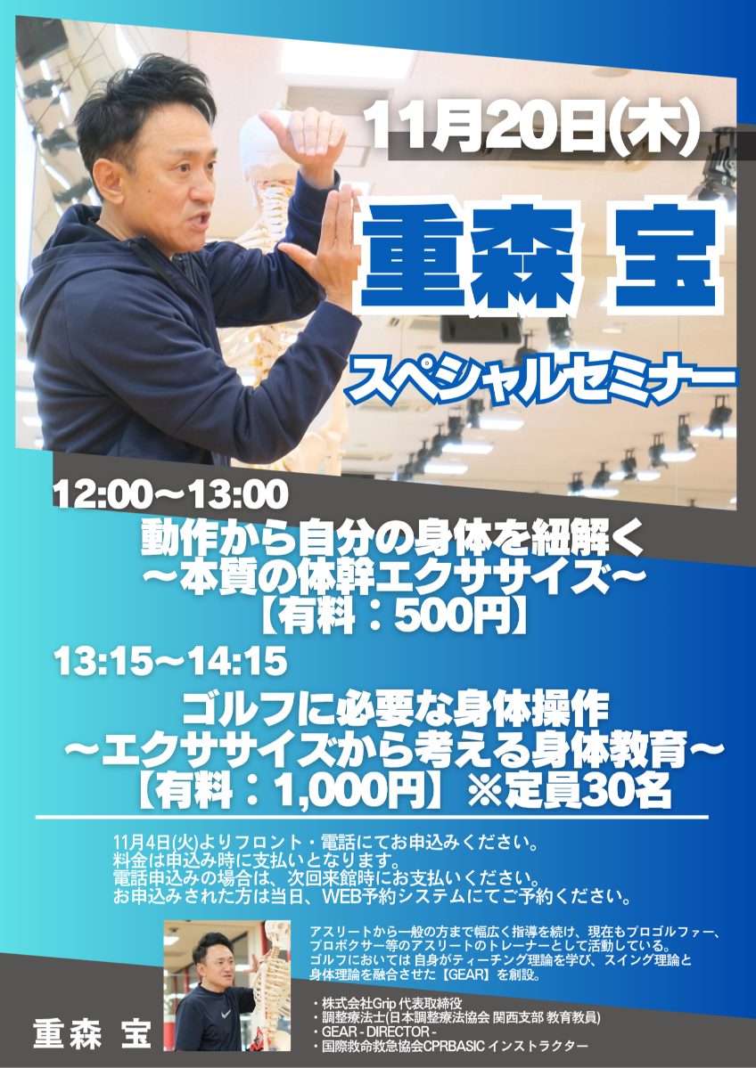 重森宝 スペシャルセミナー 2025-11-01 11月20日(木)に、アスリートのトレーナーとしても活躍されている重森宝トレーナーをお招きして、スペシャルセミナーを行います。 この機会にぜひご参加ください。