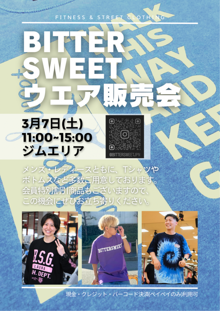 3月7日(土)に、フィットネスアパレルブランド【BITTERSWEET】のウエア販売会を行います。